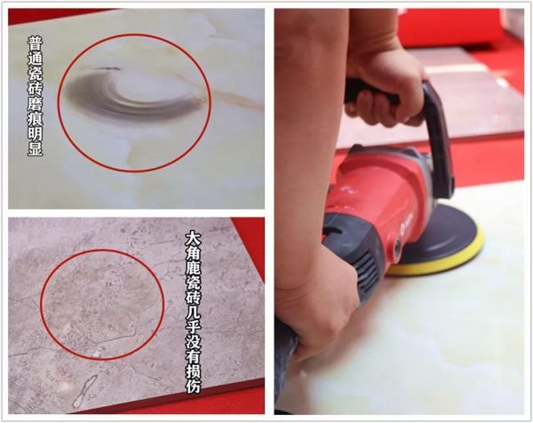 瓷砖好不好,磨磨就知道!大角鹿超耐磨大理石瓷砖品质过硬,不惧怕外力破坏,活动现场特意邀请专业人士用施工专用打磨机来挑战“超耐磨”,用它分别对普通瓷砖和大角鹿超耐磨大理石瓷砖进行高强度打磨,看看究竟谁更厉害!