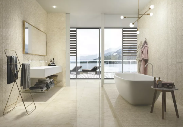 米色调,是最具包容性的色彩,也因此拥有着极宽广的适用范围。米黄大理石瓷砖,在米色的底色基础上,将天然大理石纹理中的点或线运用于瓷砖表面,赋予瓷砖和空间更强的装饰艺术性。